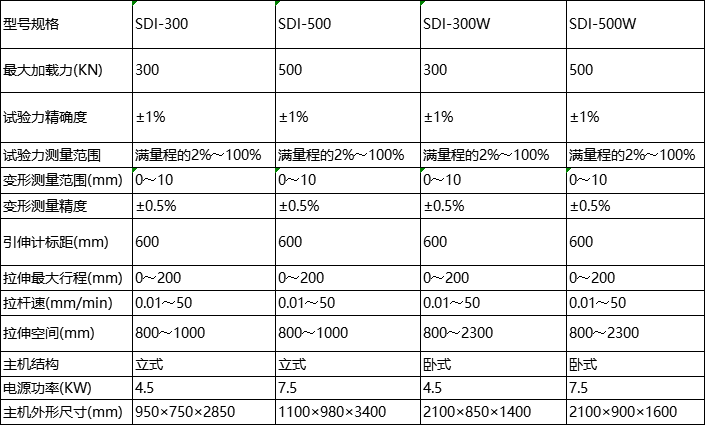 主機(jī)為四立柱或雙立柱剛性框架,有立式和臥式兩種機(jī)型,絲杠調(diào)節(jié)拉頭移動(dòng),加載速度無級(jí)設(shè)定。