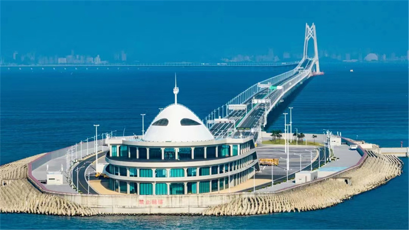 這座體現(xiàn)我國綜合國力、世界一流的大橋,全長55千米,其中包含22.9千米的橋梁工程和6.7千米的海底隧道,隧道由東、西兩個人工島連接。東、西兩個人工島猶如兩艘豪華巨輪屹立在海面上,壯觀奪目,被譽(yù)為世界人工島建造史上的奇跡。