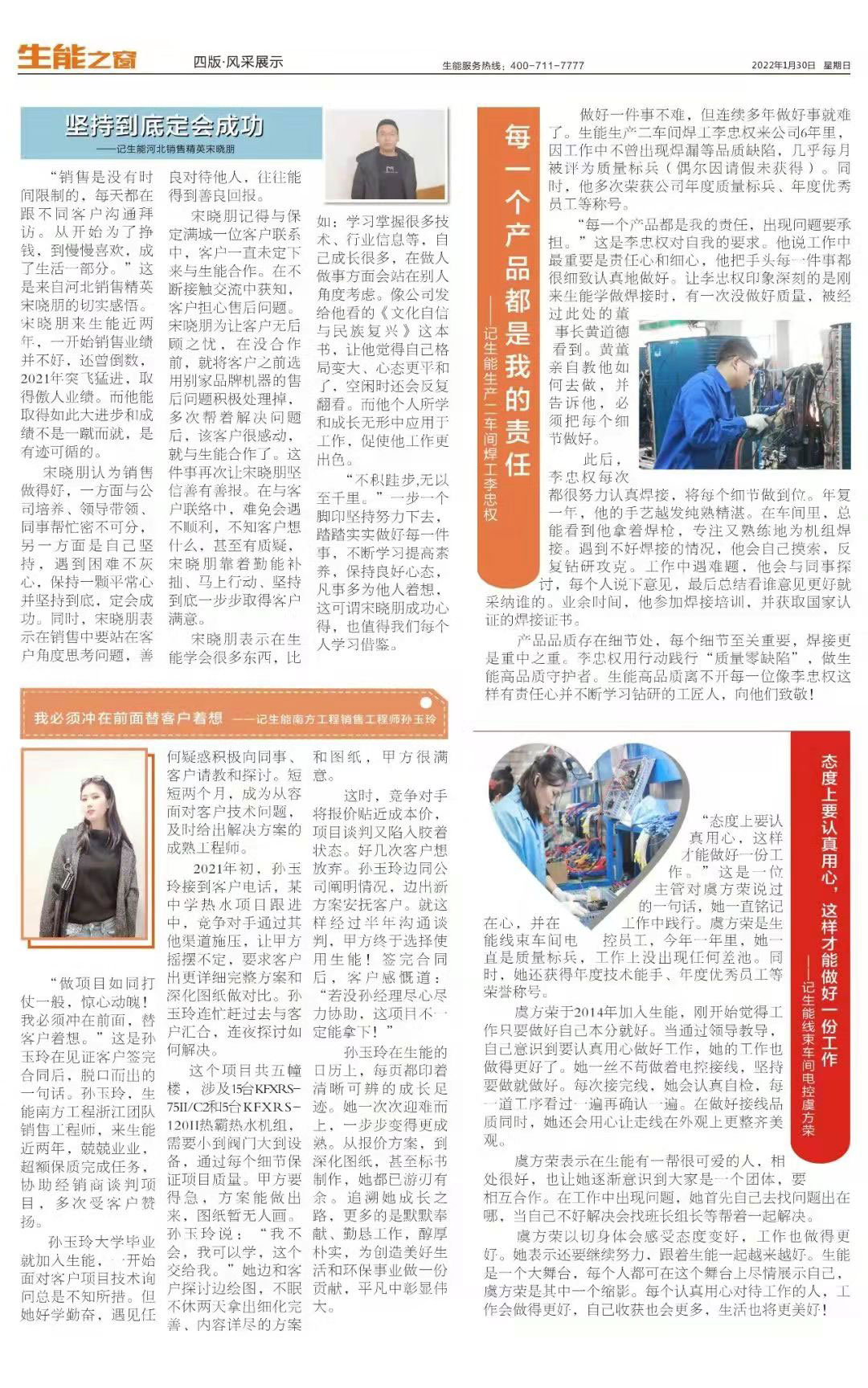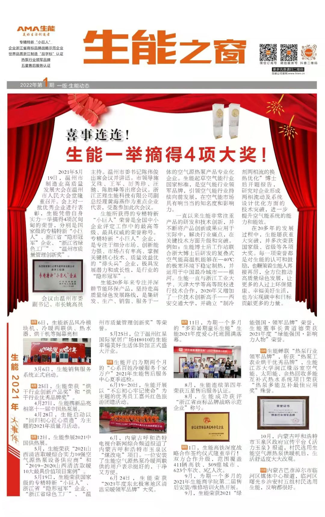 生能空氣能《生能之窗》2022年第1期簡介:本期報(bào)紙主要是對(duì)2021年的回顧和總結(jié),共分四個(gè)版面。一版為“生能動(dòng)態(tài)”,內(nèi)容主要是生能空氣能公司要聞、榮譽(yù)獎(jiǎng)項(xiàng)、上級(jí)領(lǐng)導(dǎo)視察等。二版為“生能縱橫”,內(nèi)容主要是生能空氣能經(jīng)典精品案例、技術(shù)研發(fā)、愛心公益等。三版為“市場觀察”,內(nèi)容主要是生能空氣能品牌宣傳、用戶反饋、經(jīng)銷商分享等。四版為“風(fēng)采展示”,內(nèi)容主要為生能空氣能優(yōu)秀員工的工作心得、生活感悟等。生能空氣能《生能之窗》2022年第1期詳情見如下: