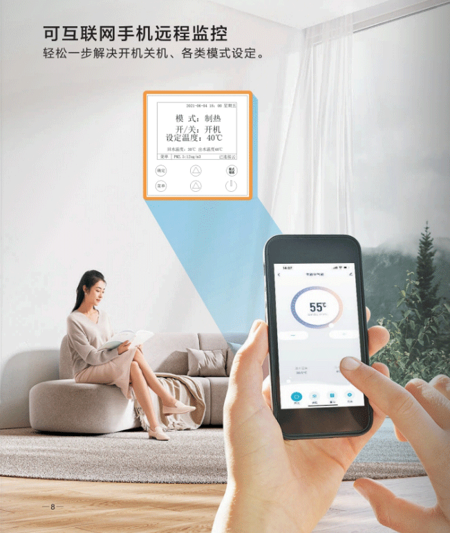 該空氣能新品標(biāo)配手機(jī)APP控制(WiFi連接):實(shí)現(xiàn)通過(guò)手機(jī)快速查詢(xún)了解機(jī)組全天候運(yùn)行情況,遠(yuǎn)程控制設(shè)備開(kāi)機(jī)關(guān)機(jī)、調(diào)節(jié)溫度等,同時(shí)還擁有設(shè)備故障預(yù)警報(bào)警功能,使用者通過(guò)手機(jī)可第一時(shí)間了解設(shè)備故障,快速便捷處理機(jī)組出現(xiàn)的問(wèn)題,進(jìn)而讓用戶(hù)安心便捷享用。