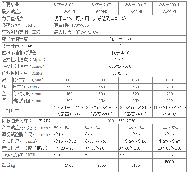 WAW-D型微機(jī)控制電液伺服萬能試驗(yàn)機(jī)主機(jī)采用油缸下置式主機(jī),主要用于金屬、非金屬的拉伸、壓縮和彎曲試驗(yàn)。適用于冶金、建筑、輕工、航空、航天、材料、大專院校、科研單位等領(lǐng)域。