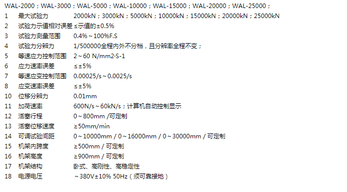 產(chǎn)品規(guī)格 WAL-2000KN;WAL-3000KN;WAL-5000KN;WAL-10000KN;WAL-15000KN;WAL-20000KN;WAL-25000KN;