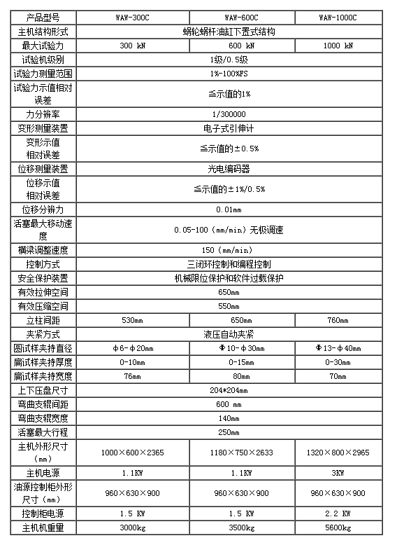 WAW-C系列微機(jī)控制電液伺服萬(wàn)能試驗(yàn)機(jī)由蝸輪蝸桿下置式主機(jī)及琴式油源控制柜組成,油泵采用意大利馬祖奇進(jìn)口低噪音高性能齒輪泵。拉伸空間位于主機(jī)上方,壓縮、彎曲試驗(yàn)位于主機(jī)下方即中橫梁和工作臺(tái)之間。試驗(yàn)空間的調(diào)整通過(guò)移動(dòng)中橫梁來(lái)實(shí)現(xiàn),中橫梁升降采用蝸輪蝸桿傳動(dòng)。計(jì)算機(jī)全自動(dòng)閉環(huán)控制高性能電液伺服閥完成對(duì)各種材料的拉伸、壓縮、彎曲等試驗(yàn)。試驗(yàn)結(jié)束后自動(dòng)采取材料的FM、REH、REL、RPO.2、RP1、RM和彈性模量E等實(shí)驗(yàn)結(jié)果。